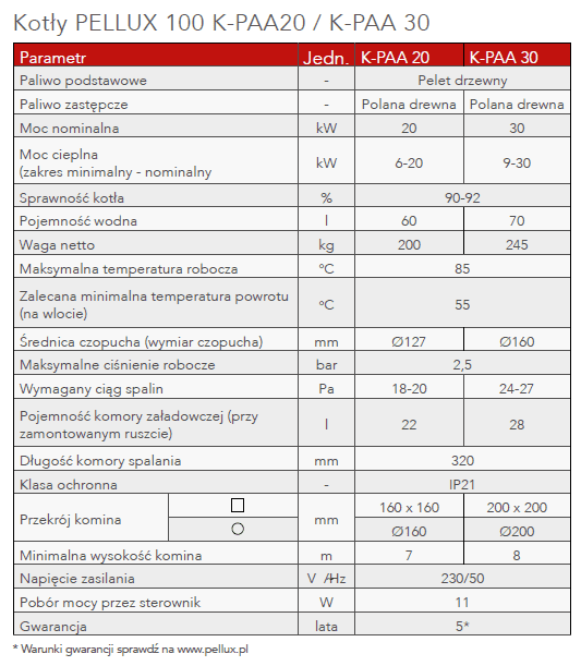 Kotły PELLUX 100 to w pełni automatyczne urządzenia grzewcze, wyposażone w mikroprocesorowe sterowanie FUZZY LOGIC II, przystosowane do spalania ekologicznego paliwa jakim jest pelet drzewny. W połączeniu z dedykowanym palnikiem zrzutkowym PBMAX oraz podajnikiem i zasobnikiem paliwa o poj. 300 lub 500 litrów, otrzymujemy zestaw, który jest w stanie praktycznie bezobsługowo dostarczyć nam niezbędnego ciepła na potrzeby c.o. i c.w.u. Rozwiązanie to zapewnia wyjątkowy komfort użytkowania bez konieczności wizyty w kotłowni nawet przez tydzień.