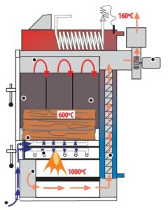 Gazy powstające w komorze spalania kotła na drewno LIGNUM NG mogą osiągać temperatury 1000ºC, dzięki wymiennikowi ciepła wyposażonemu w system zawirowaczy przepływu, ich temperatura obniża się do poziomu poniżej 160ºC, co pozwala na optymalizację zużycia paliwa. Uzyskany stopień sprawności osiąga nawet do 92%.